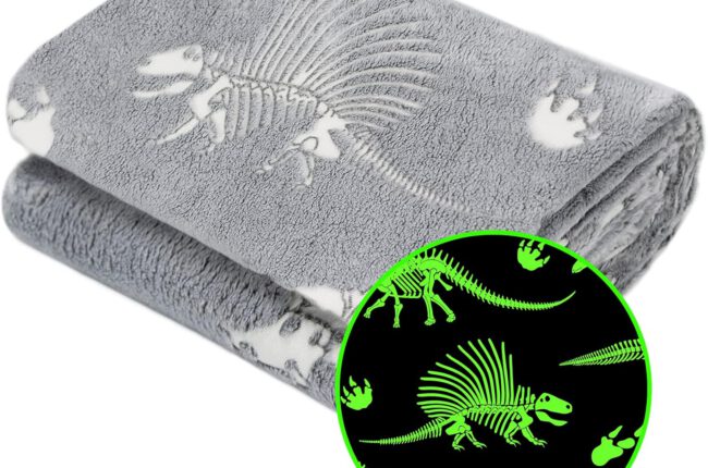 Glow in The Dark Blanket Dinosaur Throw Blanket for Boys Kids Soft Warm Cozy Cute Dino Blanket Unique Dinosaurs Toys Gifts Gray Glowing Dinosaur Room Decor Blankets for Girls Teens 50″x60″